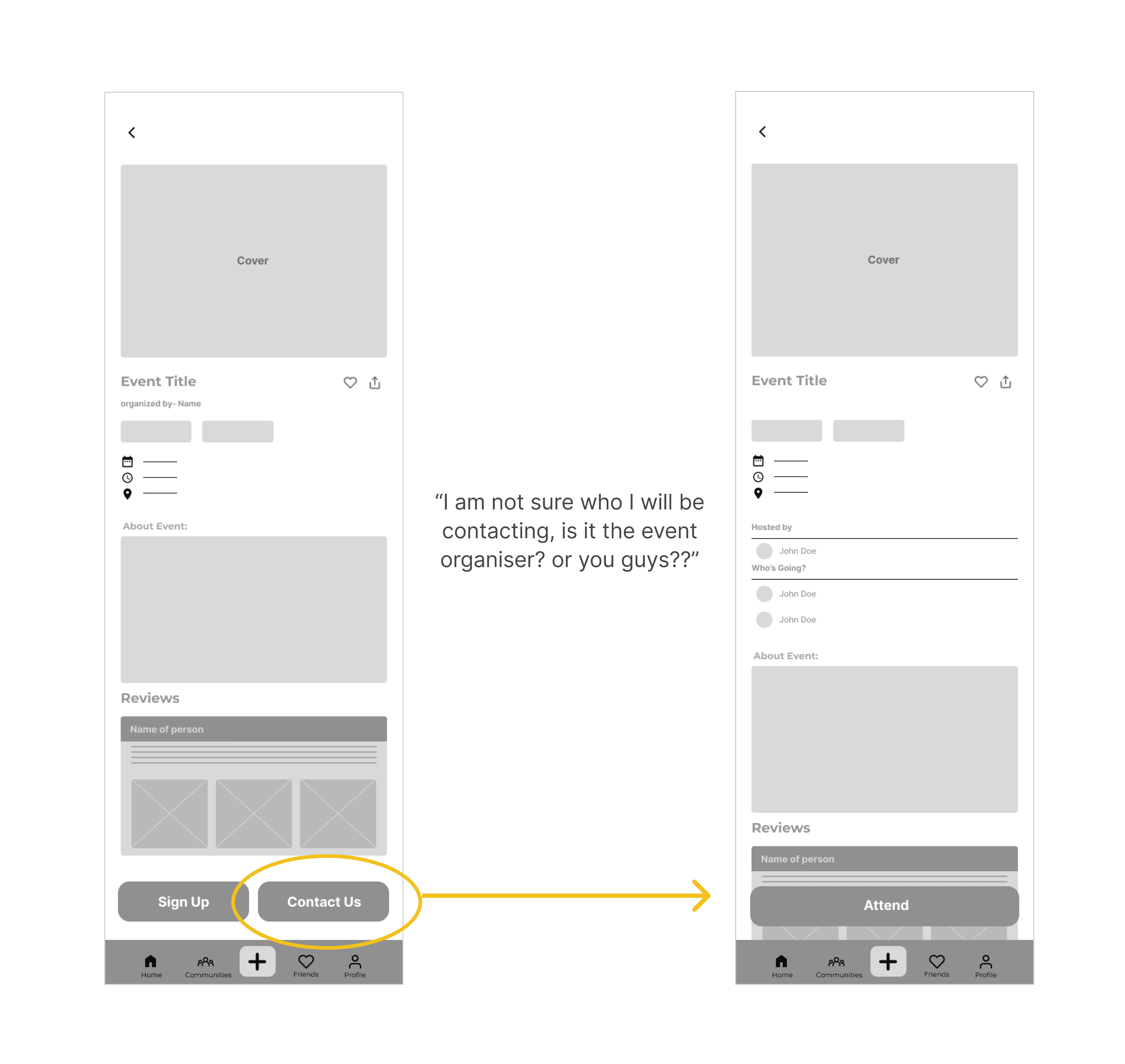 One student pointed out that the “Contact Us” button was confusing, asking, “I am not sure who I will be contacting, is it the event organiser or you guys?” To fix this, I removed the extra button and kept only the main action, “Attend,” to make the flow clear and focused.