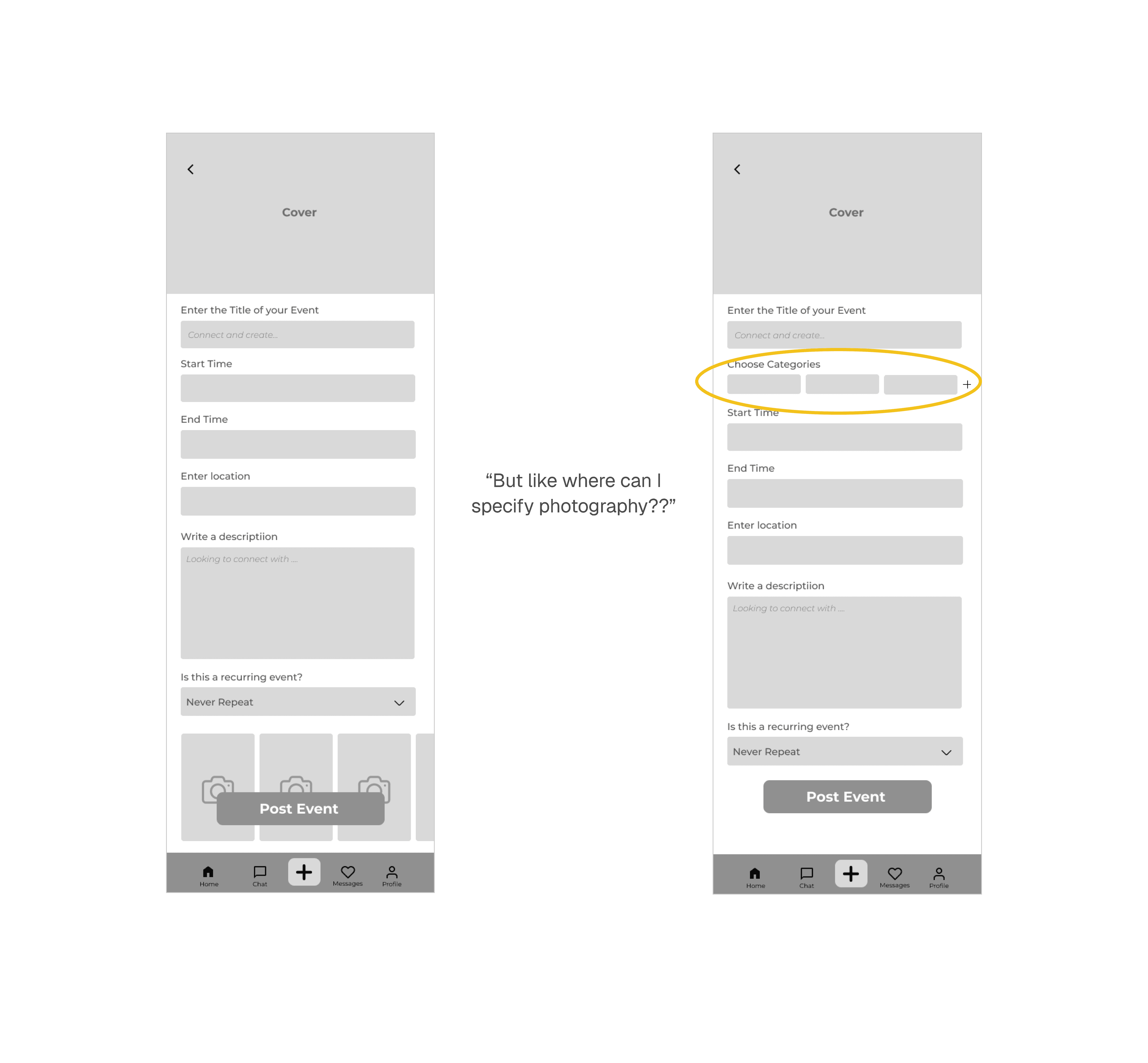 One participant asked, “But where can I specify photography?” This showed that users wanted more control over event details. To fix this, I added a “Choose Categories” field so they could label their events clearly and make them easier to find.