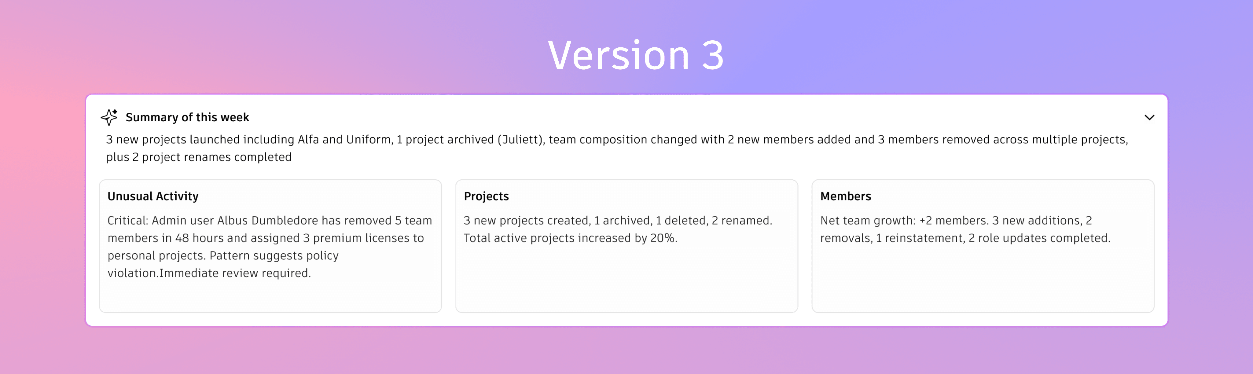 Instead of asking admins to read paragraphs, I focused on structure. Modern LLMs are naturally good at producing structured outputs like JSON, so I leaned into that strength. Rather than generating prose, the system outputs clearly defined chunks: categories, counts, and short statements that can be mapped directly to UI components.