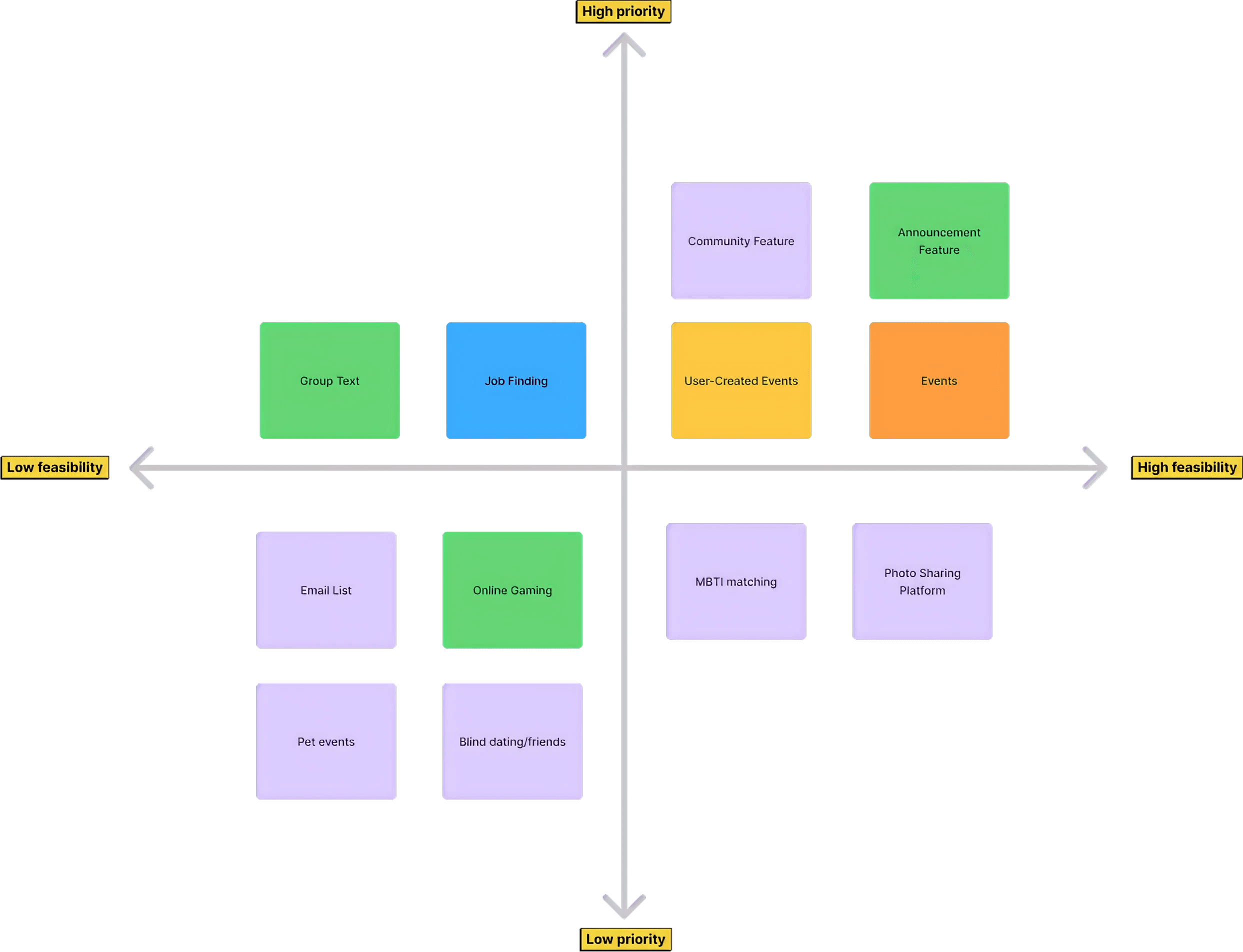 Features like Event discovery, user-created events, and community features emerged as high-priority directions to explore further, as they directly addressed students’ social needs while remaining practical to design and test.