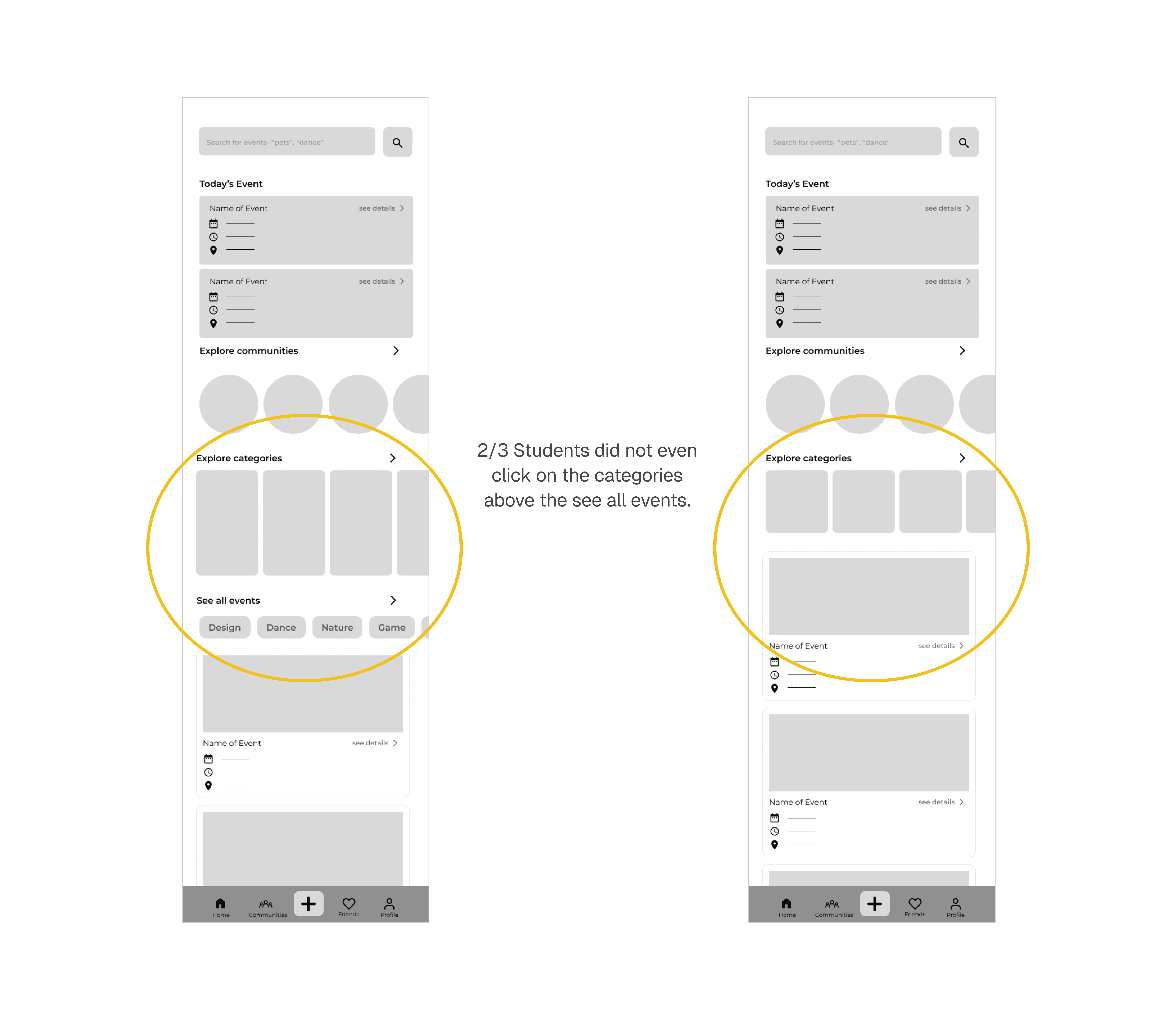 Two out of three students ignored the event categories and directly scrolled through all events. This showed that the section wasn’t drawing enough attention, so I made it more visually distinct to encourage interaction.