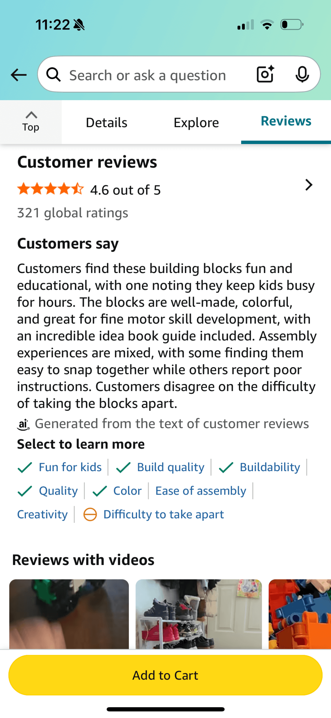 Amazon summarizing customer reviews with AI above all the reviews