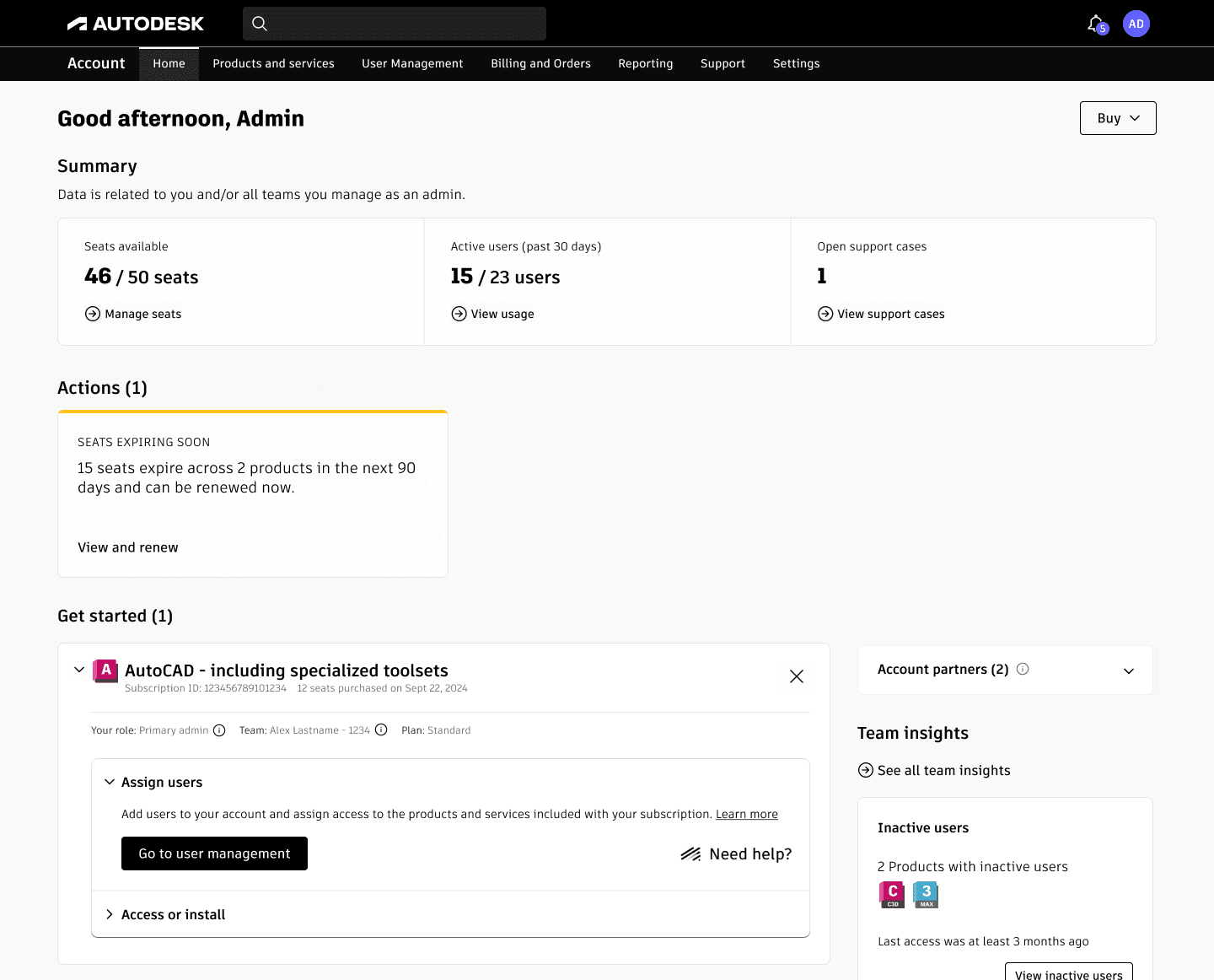 Autodesk Account is where organizations control everything related to Autodesk software like users, teams, admin roles, licenses, product access, billing, and activity. It is used by IT administrators and program managers who manage access for hundreds of engineers, architects, designers, consultants, and contractors across projects.