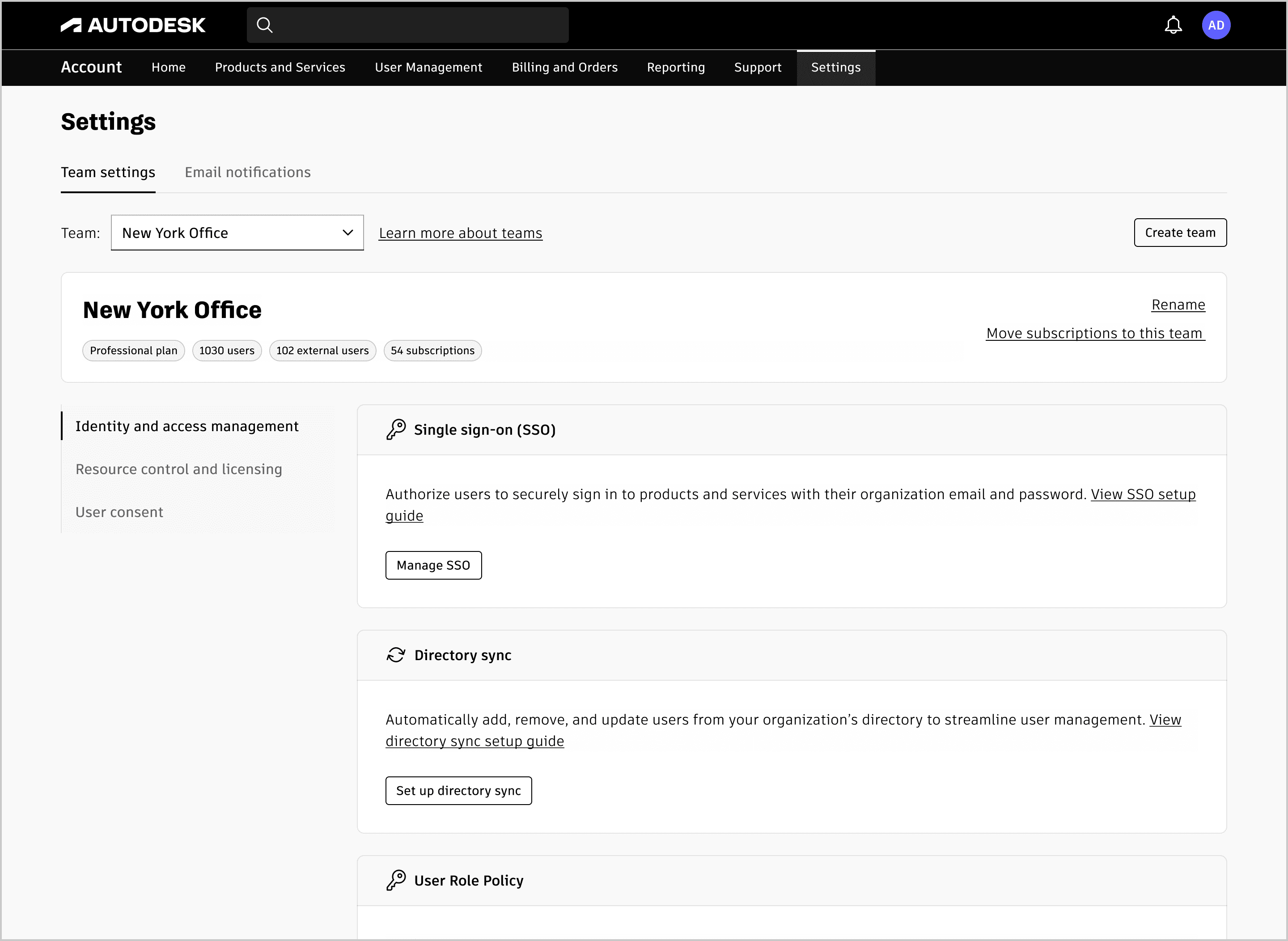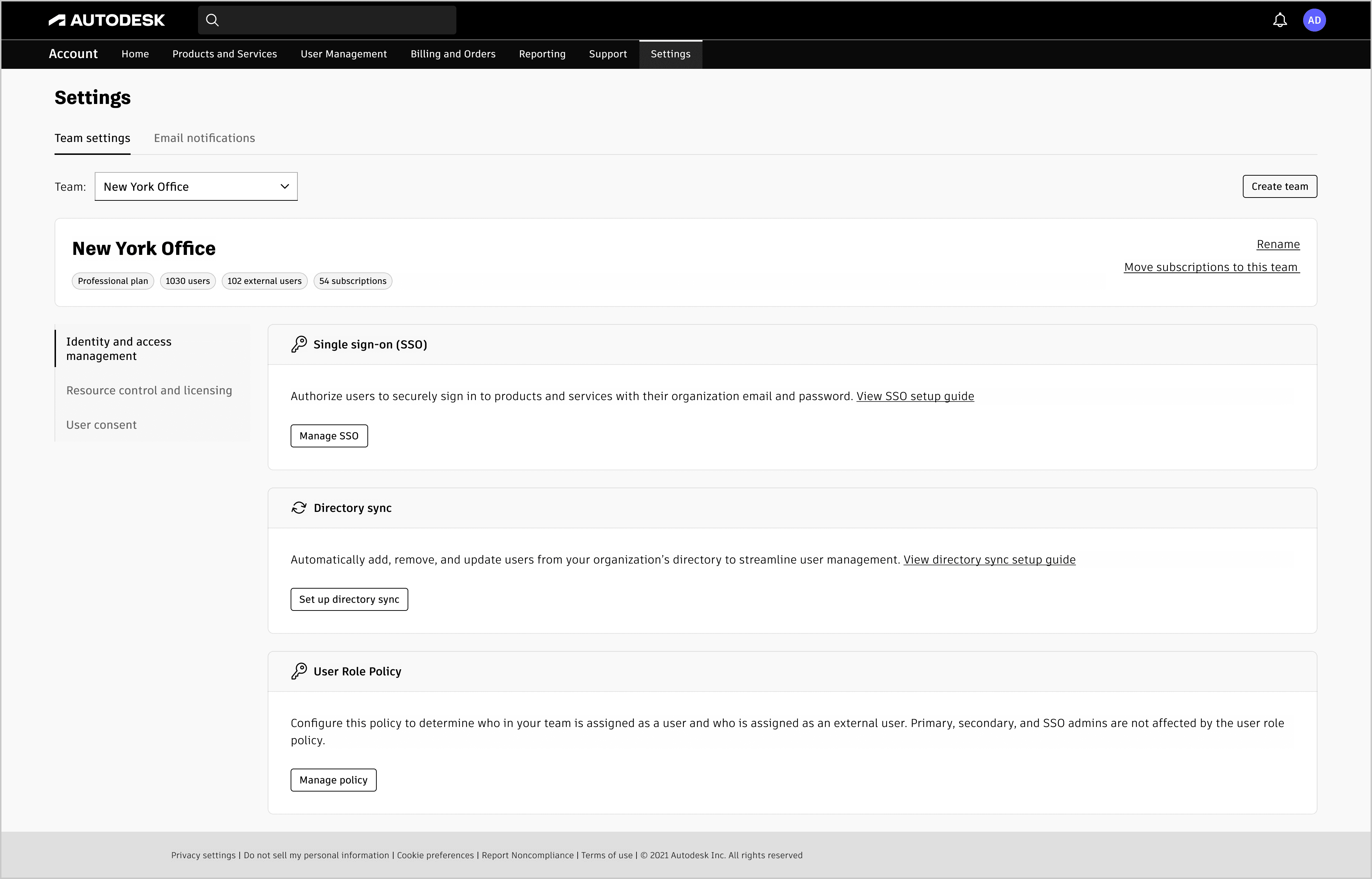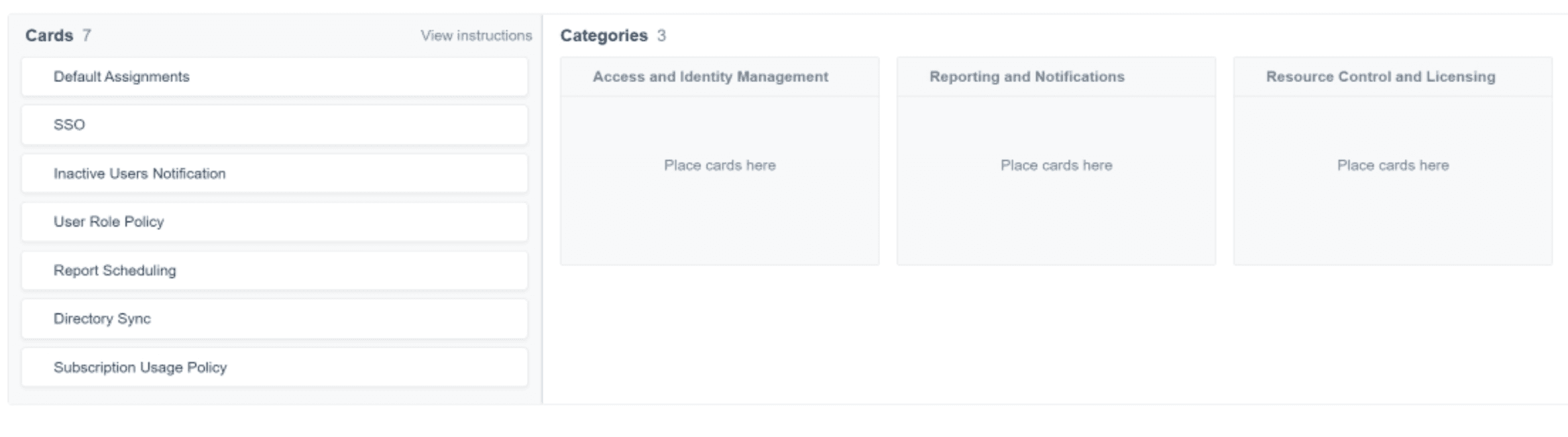 Admins sorted settings like SSO, Directory Sync, and Default Assignments into predefined categories such as Identity and Access Management, Resource Control & Licensing, and Reporting and Notifications.