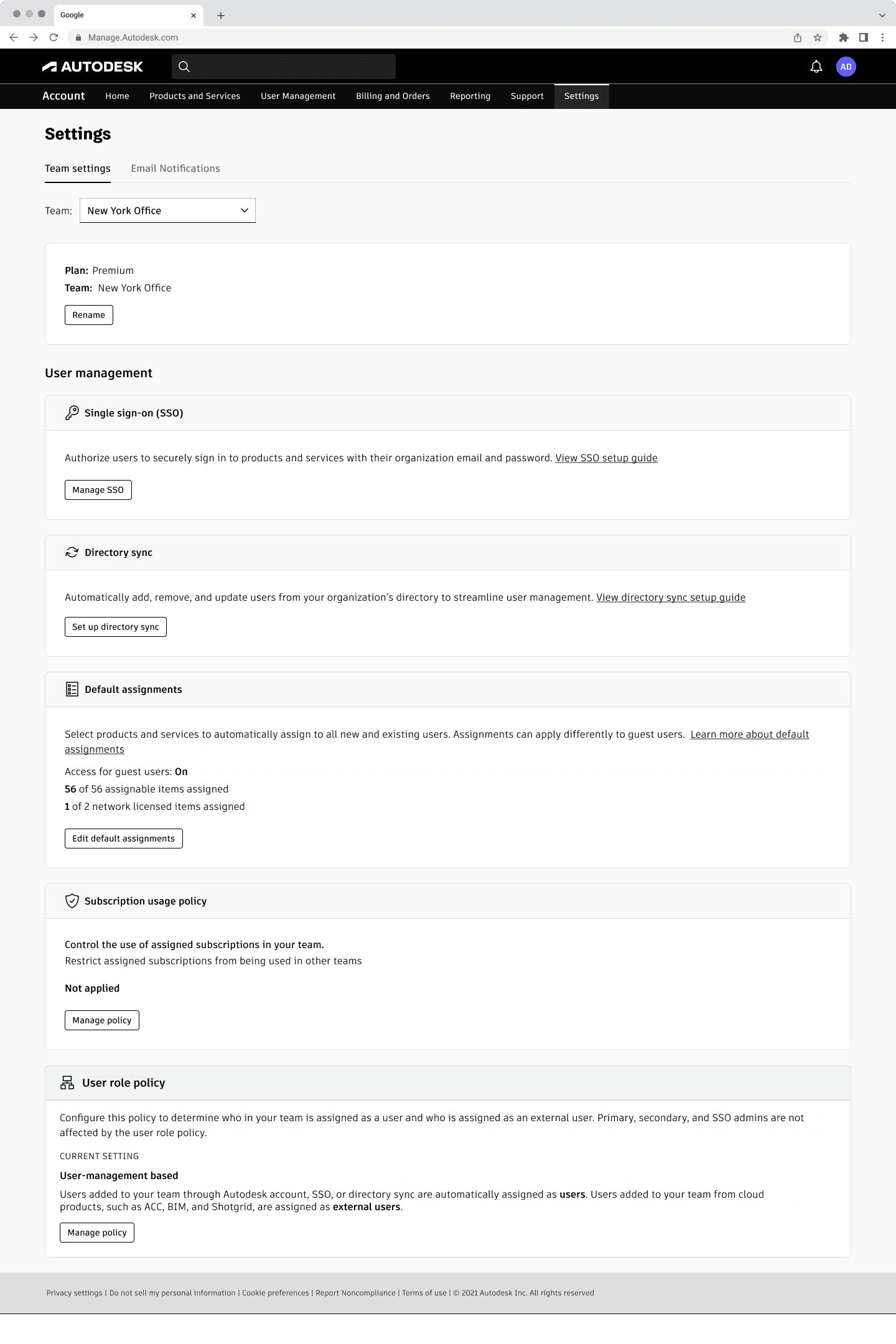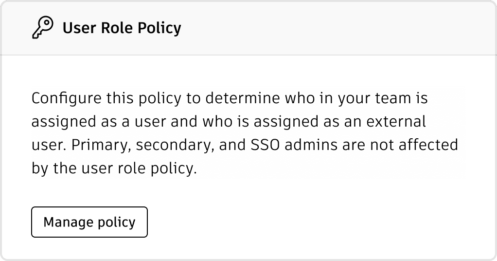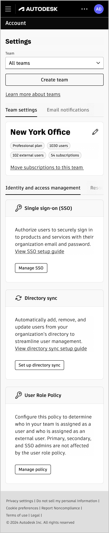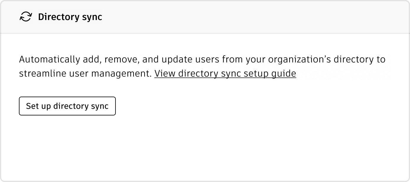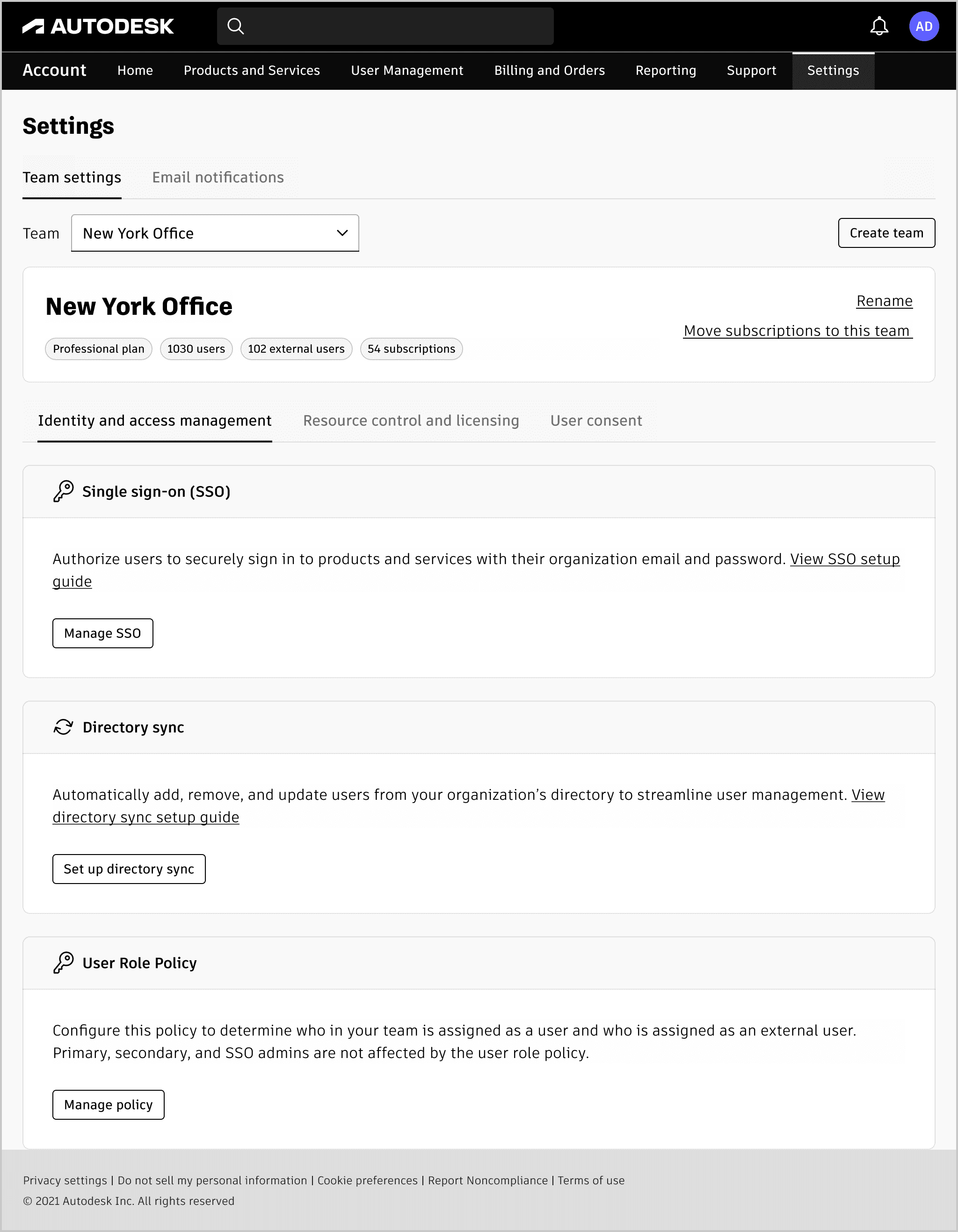 Admins sorted settings like SSO, Directory Sync, and Default Assignments into predefined categories such as Identity and Access Management, Resource Control & Licensing, and Reporting and Notifications.
