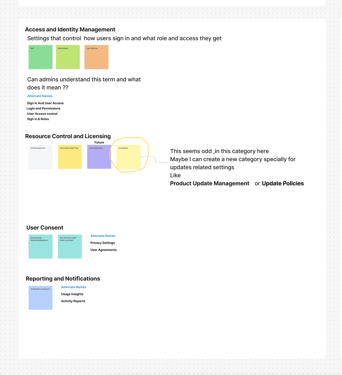 The initial name I used for one category was “Reporting & Notifications.” During feedback, the Delivery team shared that they were planning to add more Email-related settings in the future.